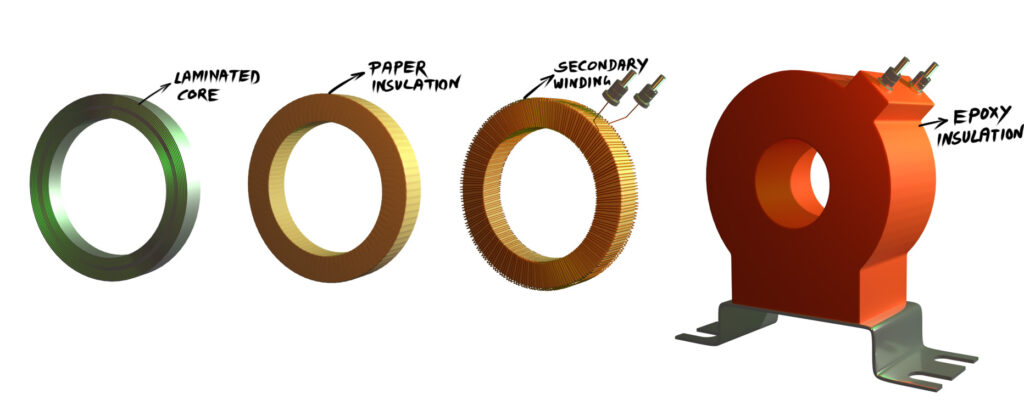 We wind the secondary winding on the CT core. Manufacturers use laminated strips made from cold-rolled grain-oriented (CRGO) silicon steel or nanocrystalline material to form the core. They place paper or plastic insulation over the core. After that, they wrap the secondary winding on the ring-type core. Then, epoxy or resin cast together the secondary terminals, core, secondary winding and the insulated bar section.