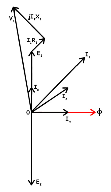 \(V_1\) is the applied primary voltage. \(V_1\) must overcome several voltage drops. First, it drops across primary resistance \(R_1\). The drop is \(R_1I_1\) in phase with \(I_1\). Next, it drops across leakage reactance \(X_1\). The drop is \(X_1I_1\) leading \(I_1\) by 90°. Finally, \(V_1\) must balance \(E_1\). Therefore: \[V_1 = E_1 + I_1R_1 + jI_1X_1\]