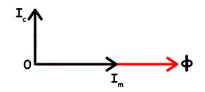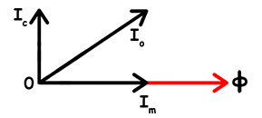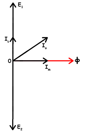 Magnetizing Current: The magnetizing current \(I_m\) creates the flux. Therefore, \(I_m\) is in phase with \(\phi\). Consequently, \(I_m\) also lies on the horizontal axis. This current magnetizes the transformer core.