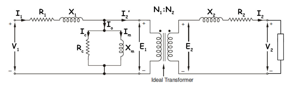 Representing the Magnetizing Current: \(I_m\) represents the magnetizing current. We model this using a reactance \(X_m\). \(X_m\) also connects in parallel with \(R_c\). Together, \(R_c\) and \(X_m\) form the excitation branch. Since, the No-Load current \(I_o\) is the sum of \(I_c\) and \(I_m\), we represent \(R_c\) and \(X_m\) in parallel combination. This branch connects across the primary winding.