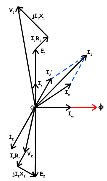 The actual primary current \(I_1\) has two components. First component is \(I_o\) (the no-load current). The second component is \({I_2}’\) (the load component). Thus: \[I_1 = I_o + {I_2}’\text{(vector sum)}\]This, \({I_2}’\) is nearly opposite to \(I_2\) direction. Let me now draw the complete vector diagram of transformer.