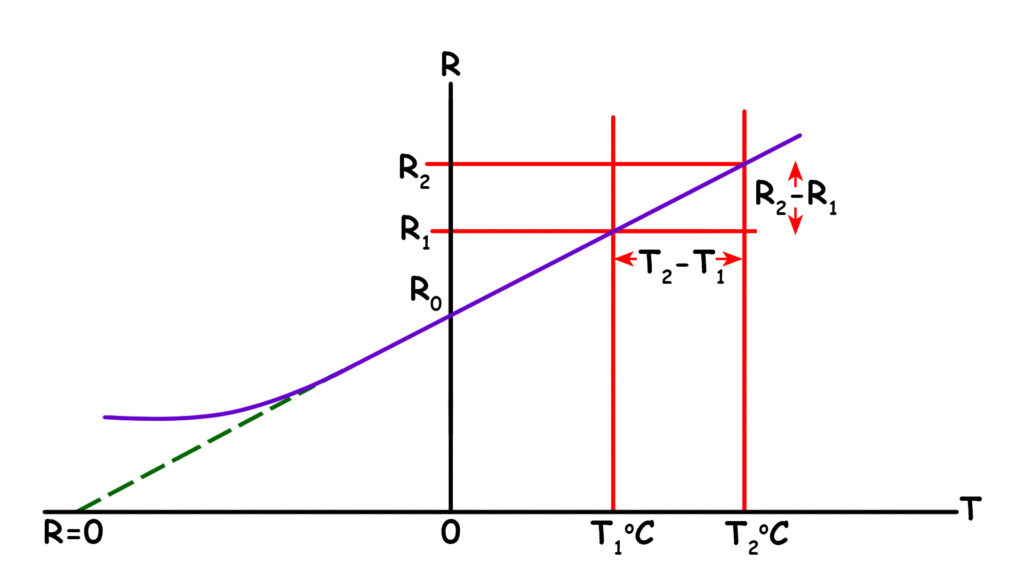 If R1 is the initial resistance of a particular resistor or conductor at T1 °C, and R2 is the resistance at T2 °C, then we can write\[R_2 – R_1 \propto T_2 – T_1\]