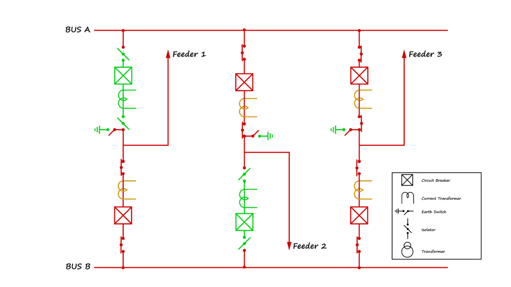 - Bus Coupler: A bus coupler switch interconnects the two busbars. It allows operators to transfer a feeder from one bus to another.