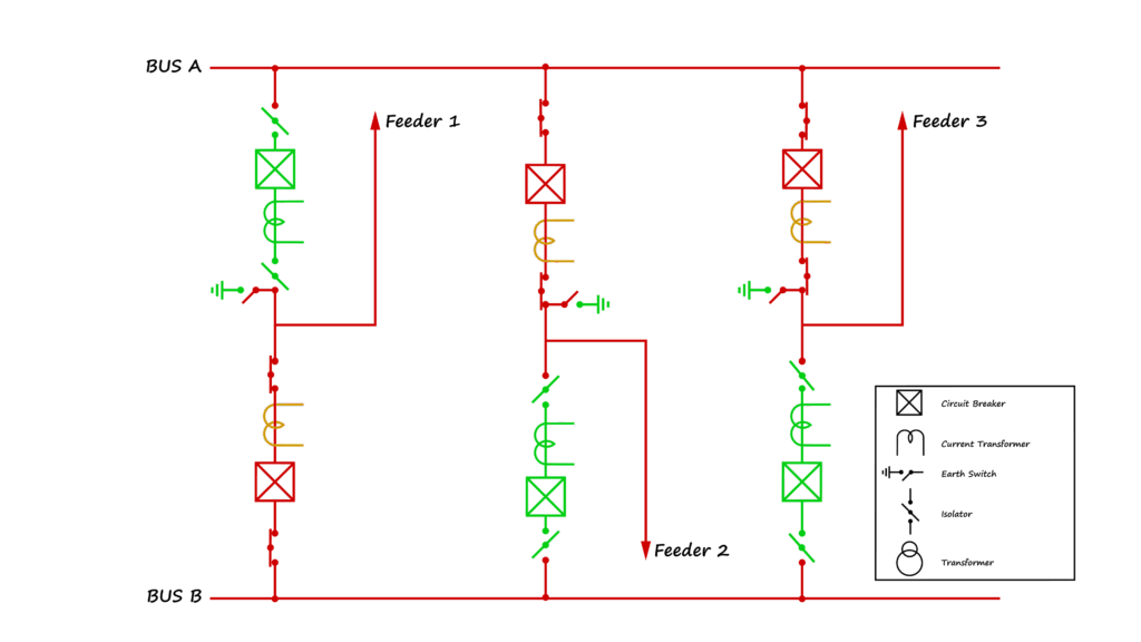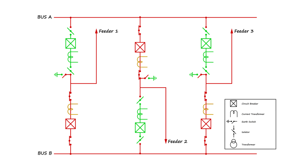 - Flexible Maintenance: In the diagram, the red section indicates live components. In contrast the green section indicates dead or isolated parts. We can easily take the green-side circuit breakers and current transformers into maintenance. During this period, the feeders remain active through the closed breakers on the red side. This ensures an uninterrupted supply even during the maintenance of circuit breakers and associated current transformers.