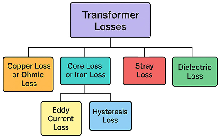 Two types of losses occur in a transformer. We refer to these losses collectively as losses in Transformers. These two losses are no-load losses and copper losses. We also often refer to the no-load losses as core losses. These losses occur due to the magnetic material of the core of the transformer. These losses include both hysteresis loss and eddy current loss. The core flux remains constant at both the no-load condition and the loaded condition. In other words, the core losses more or less remain constant at all loading conditions of the transformer. So, we refer to the core losses as the constant losses of the transformer.