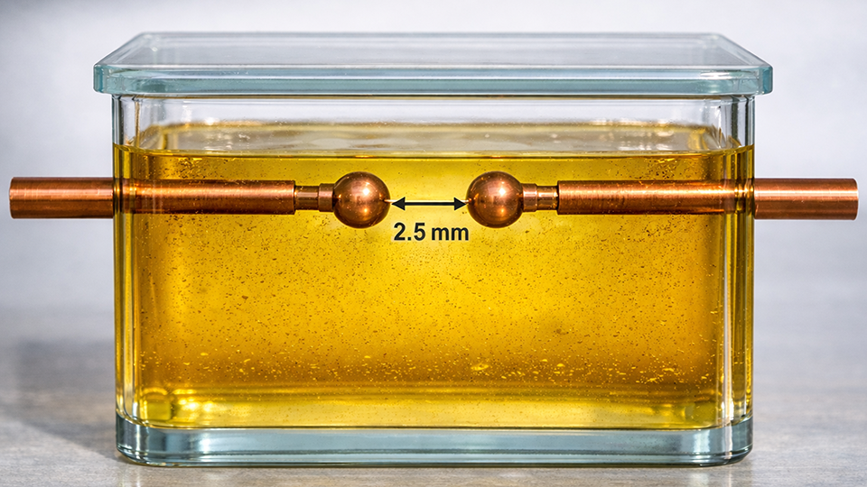 Breakdown Voltage (BDV) indicates the voltage above which an oil electrically breaks down. According to IS 335, new unfiltered transformer oil should have a breakdown voltage above 30 kV (rms) when tested with a 2.5 mm gap. For filtered new transformer oil, it is greater than 60 kV (rms) when tested with a 2.5 mm gap.
